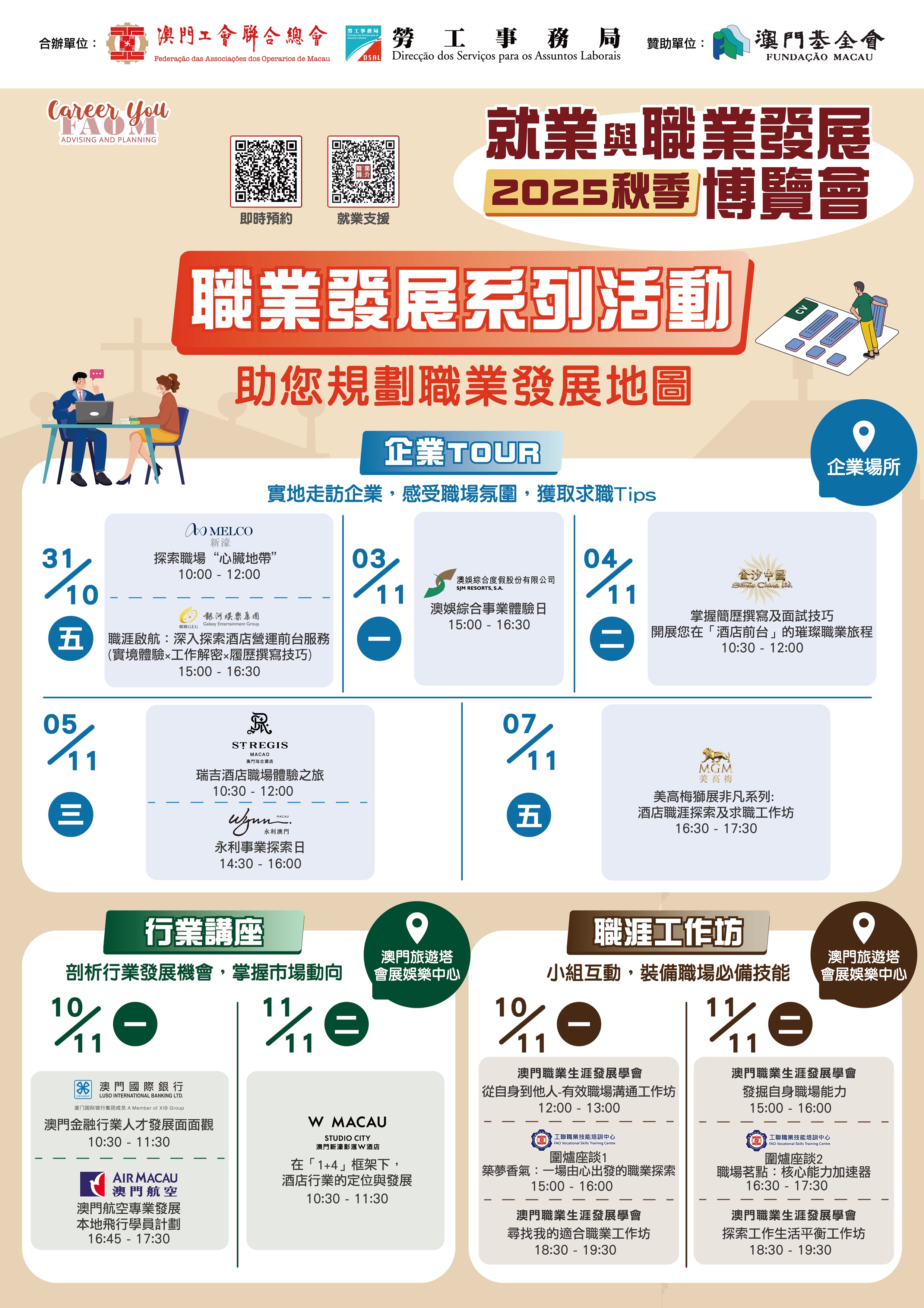 為持續協助澳門居民拓展職業發展、助力緊握發展機遇,促進人才與企業對接;澳門工會聯合總會與勞工事務局將於2025年11月10日至11日一連兩日假澳門旅遊塔會展娛樂中心四樓聯合舉辦大型招聘會,2025秋季“就業與職業發展博覽會”以“多元就業渠道、行業職涯交流、現場面試招聘及職涯輔助服務”四大方向為主軸,特設“職業發展系列活動”,其中聯合部分招聘企業推出企業參觀+求職技巧的活動(企業Tour),讓參與者親身體驗企業環境與文化,從中更能透過過程獲得實用求職技巧,助力增強居民就業能力與職業發展。