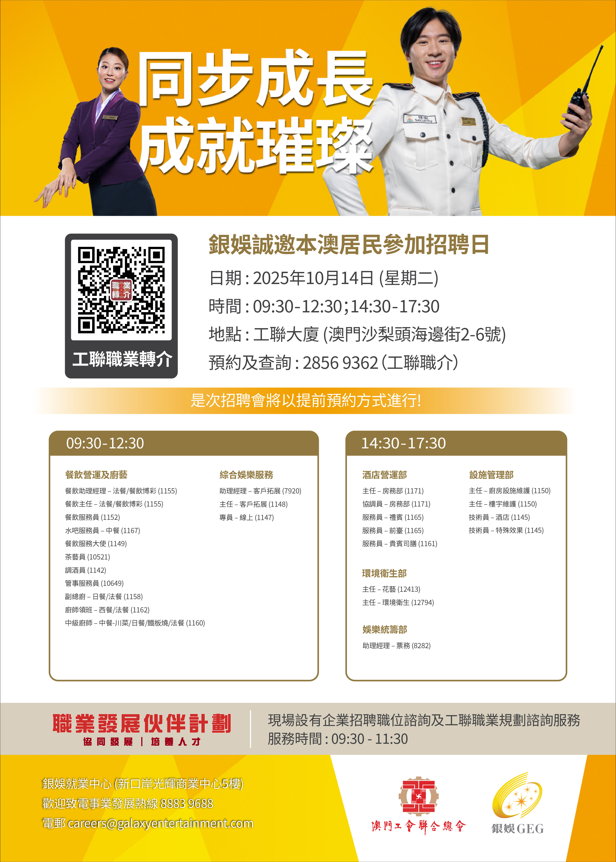 #奮發有為共譜新篇 #推動經濟社會發展 #工聯總會 #企業聯動 #企業職位諮詢 #工聯職業規劃諮詢 #職業發展 #就業指導 #職工服務 #職業配對 #銀河娛樂集團 #酒店業 #餐飲營運及廚藝 #綜合娛樂服務 #設施管理 #酒店營運 #環境衛生 #娛樂統籌