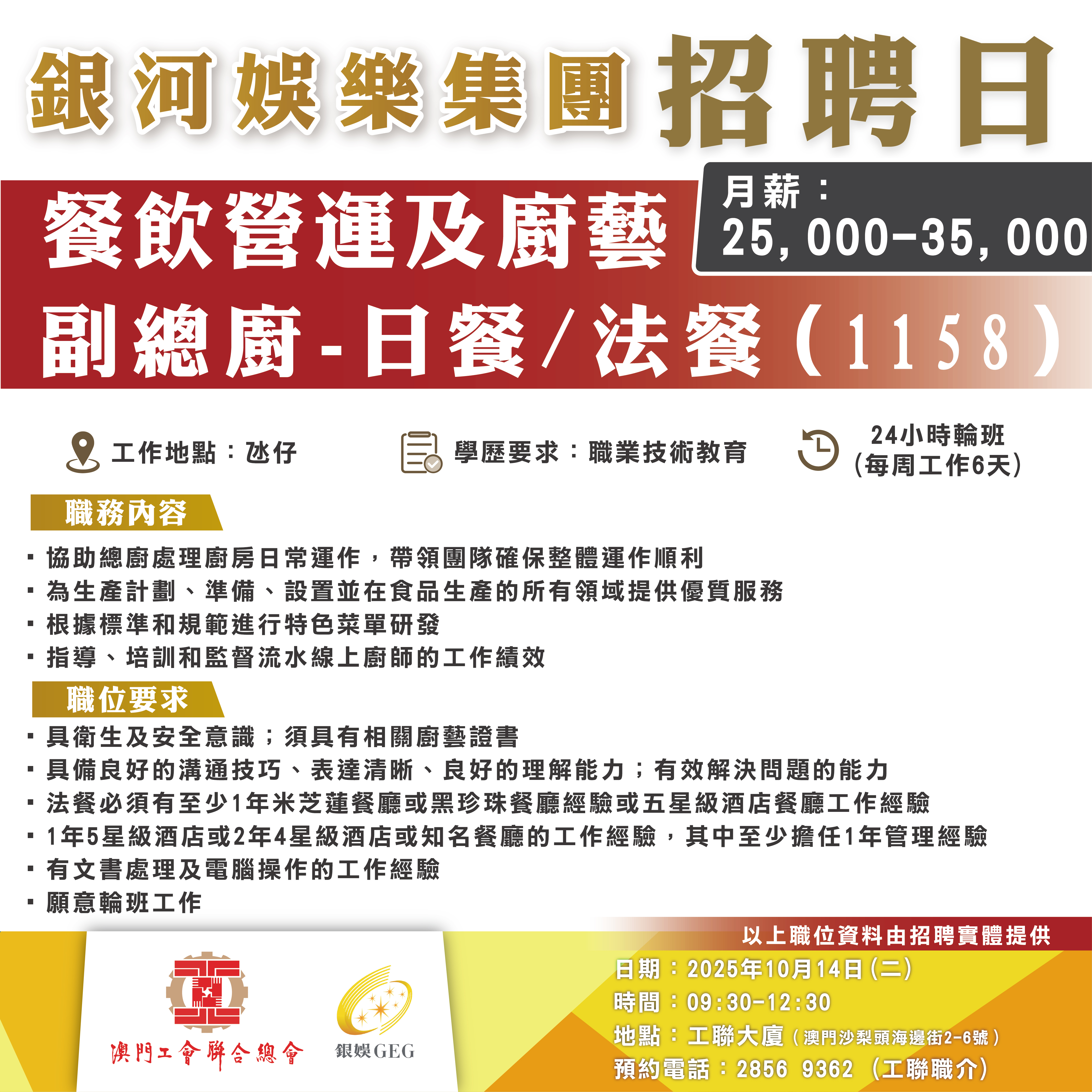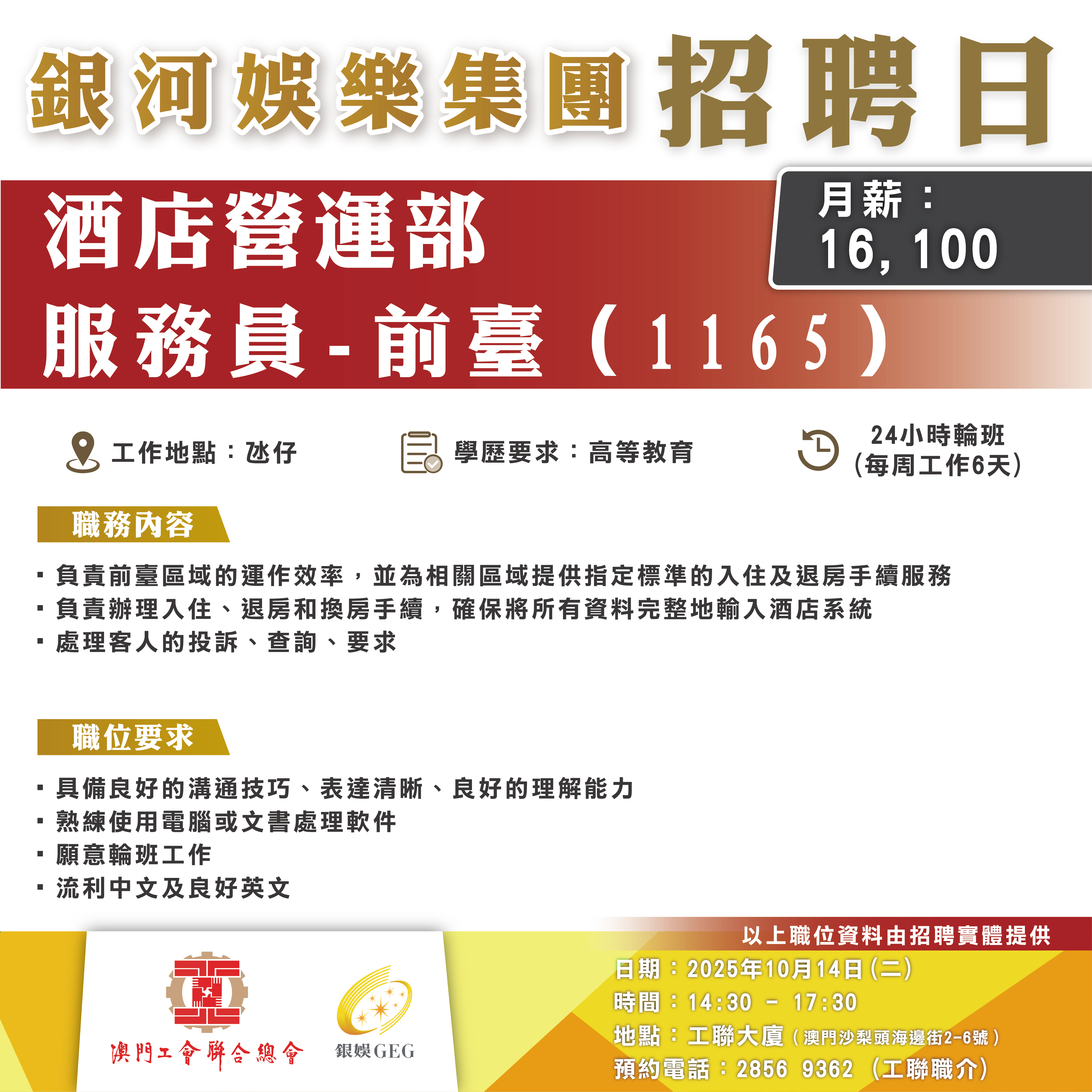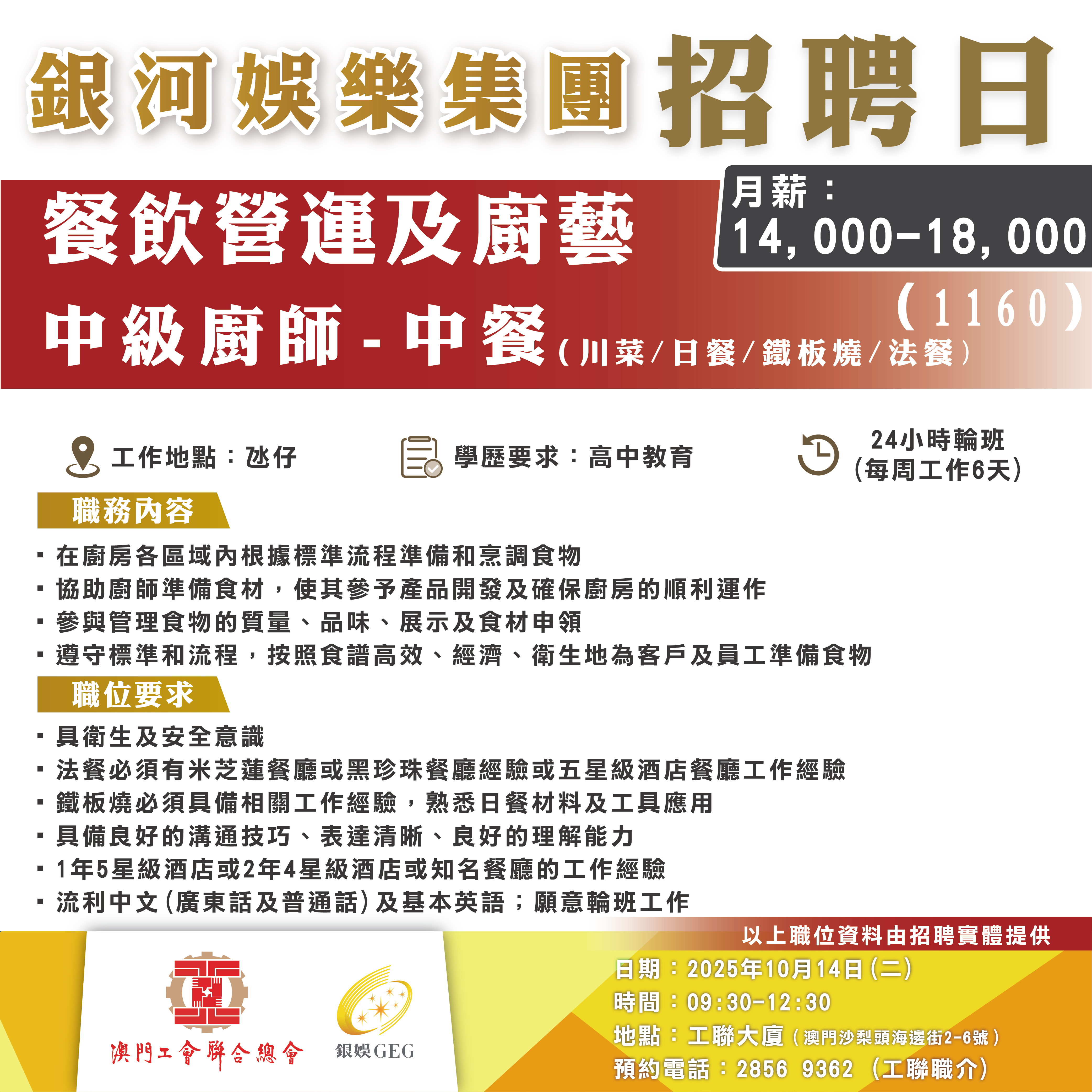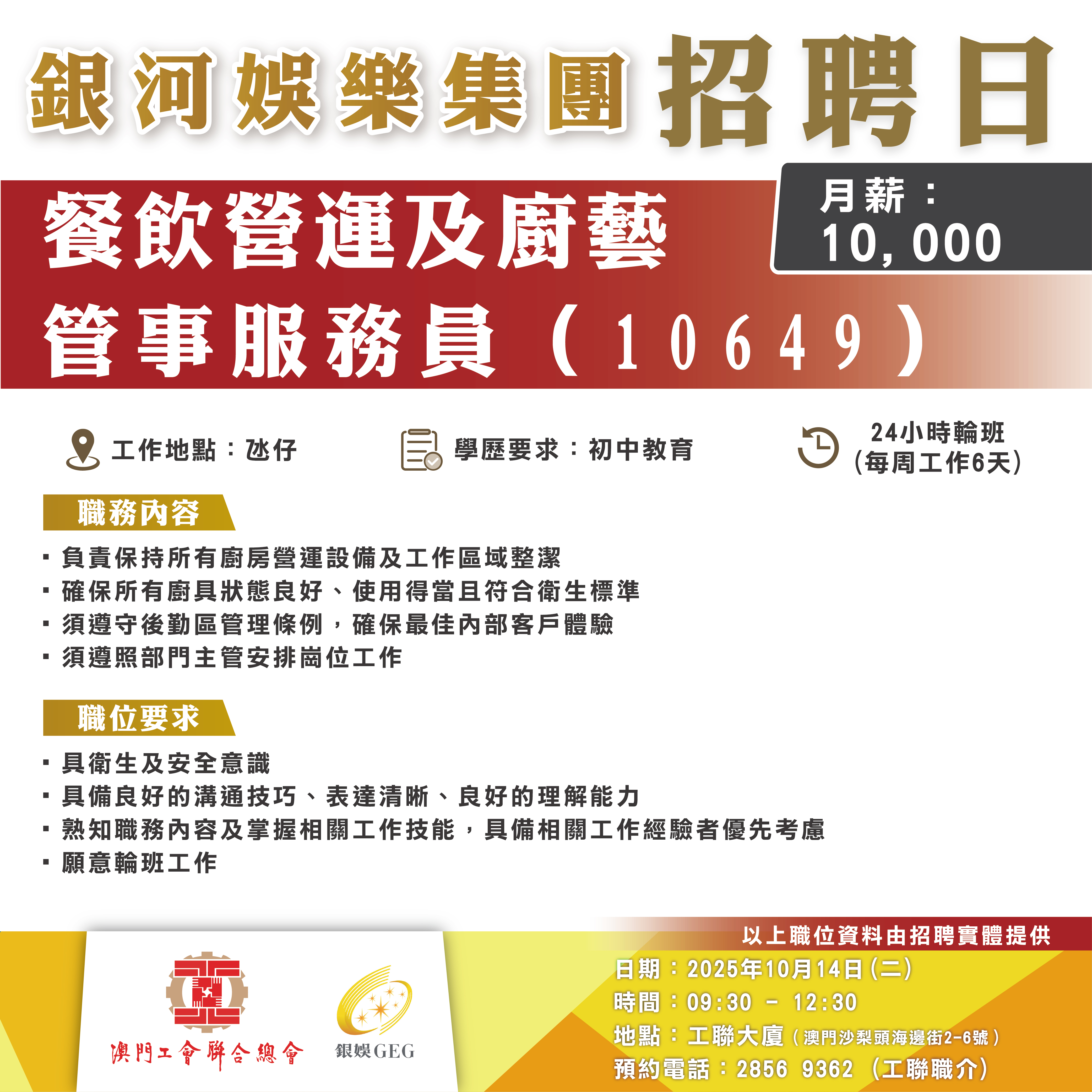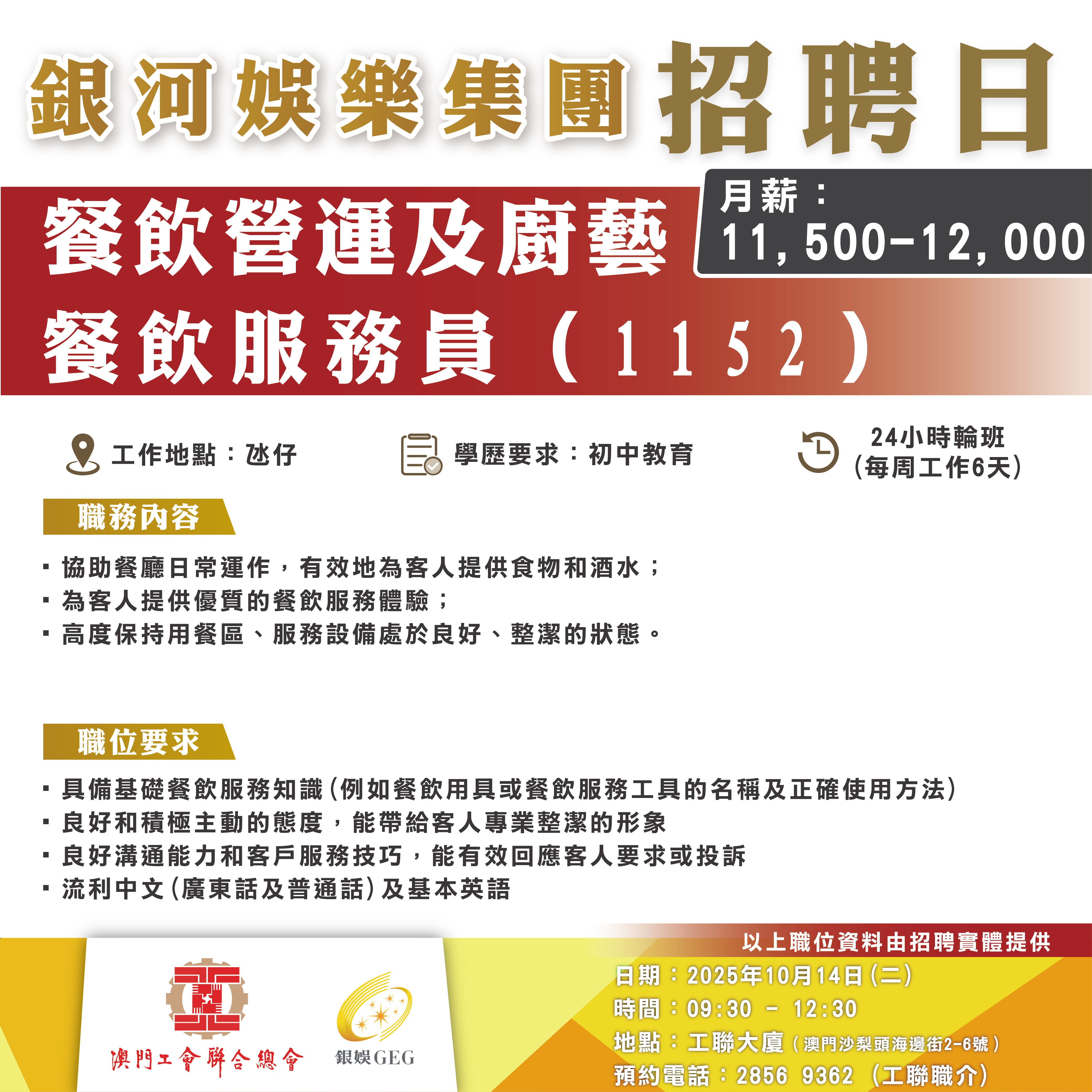 10月14日工聯總會與銀河娛樂集團舉辦招聘日,招聘日將提供將提供餐飲營運及廚藝、綜合娛樂服務、酒店營運、設施管理部以及娛樂統籌等多個部門職缺!