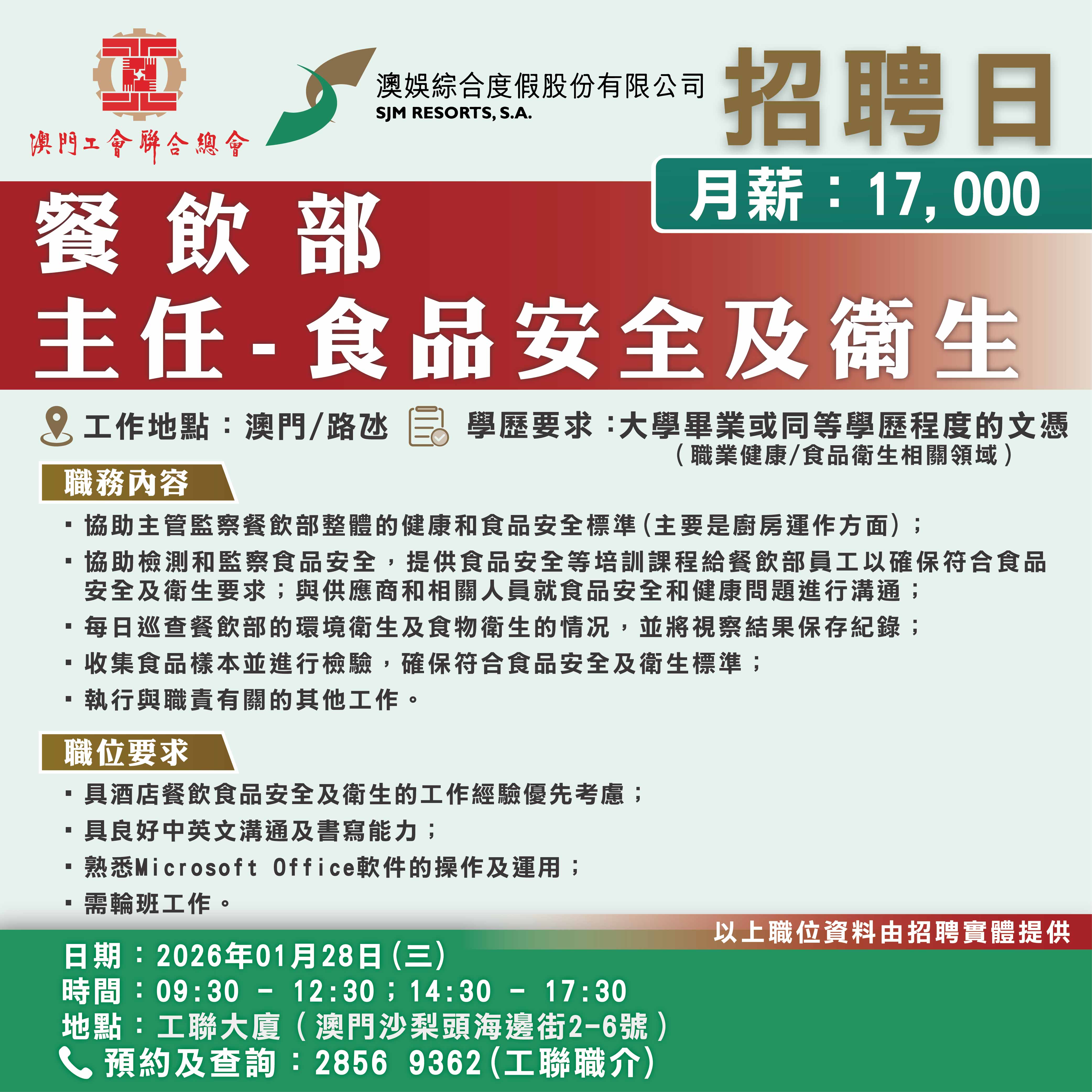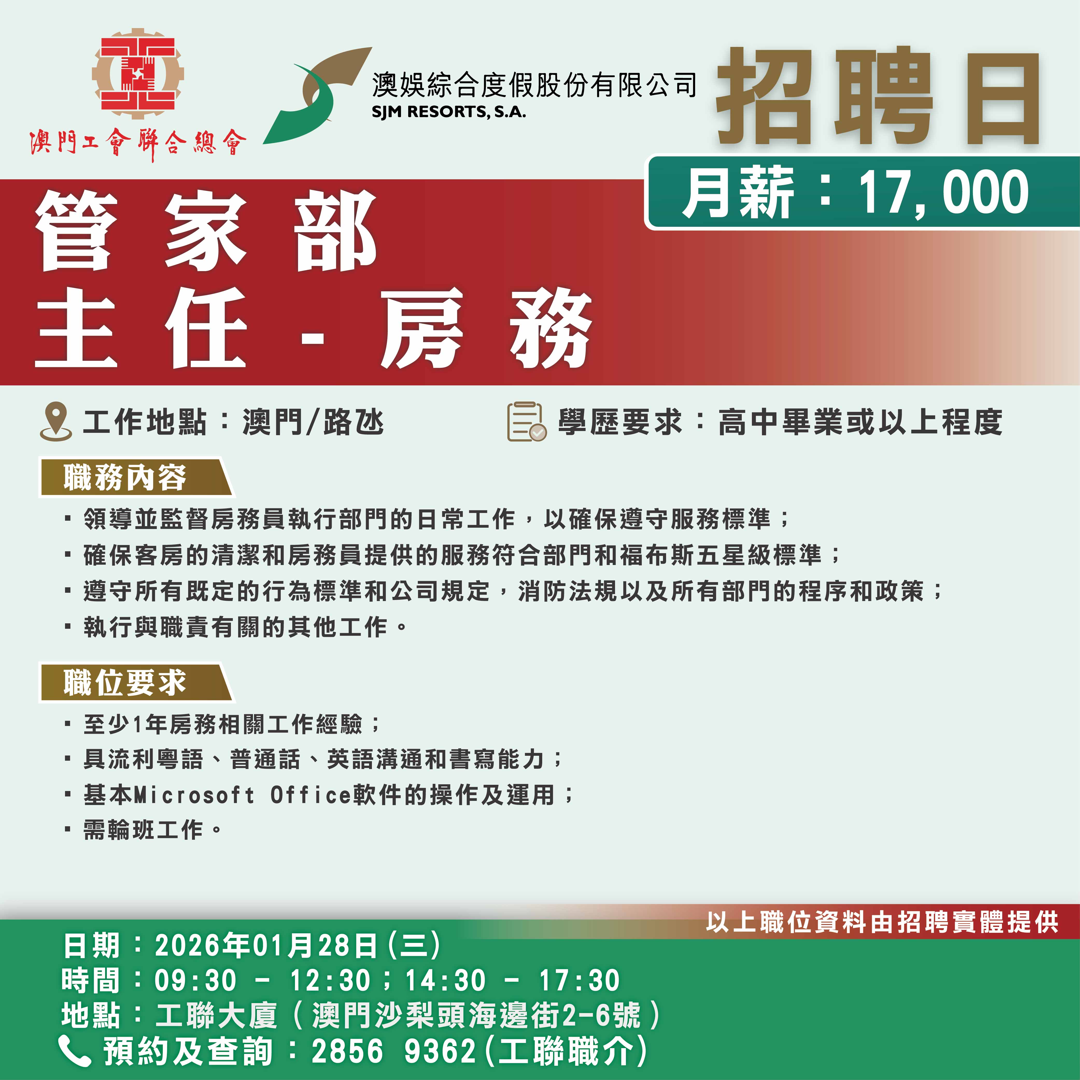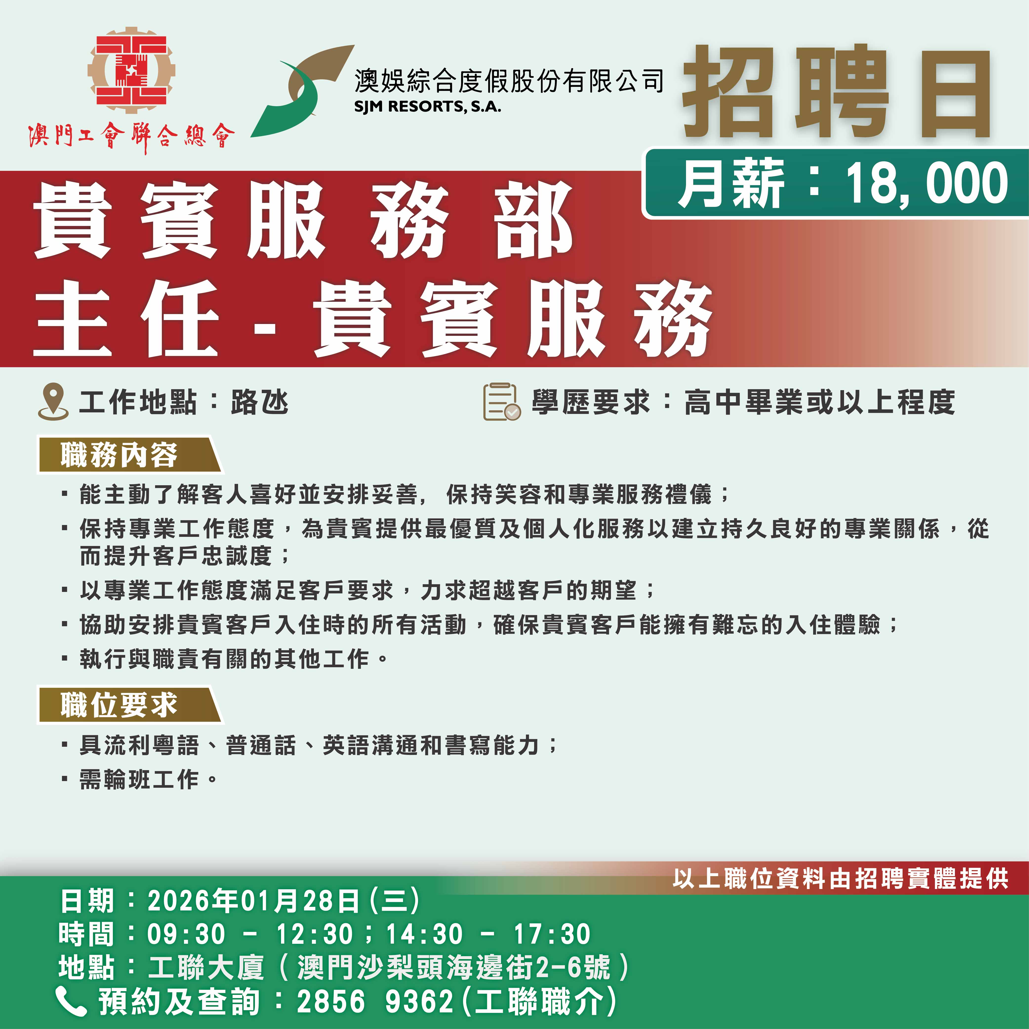 1月28日工聯總會與澳娛綜合度假股份有限公司舉辦招聘日,招聘日將提供餐飲部、貴賓服務部、酒店營運部以及銷售部等多個部門職缺!