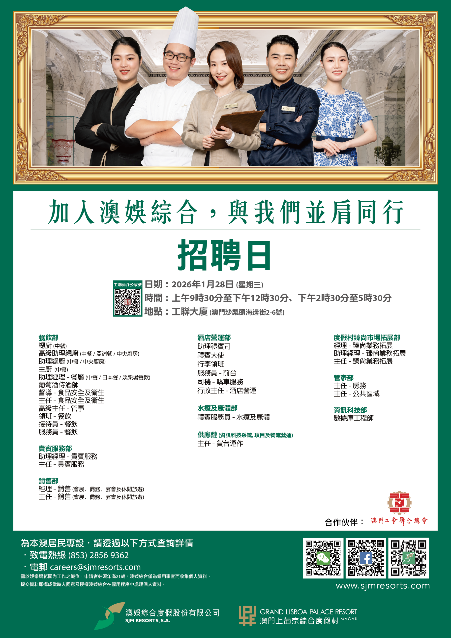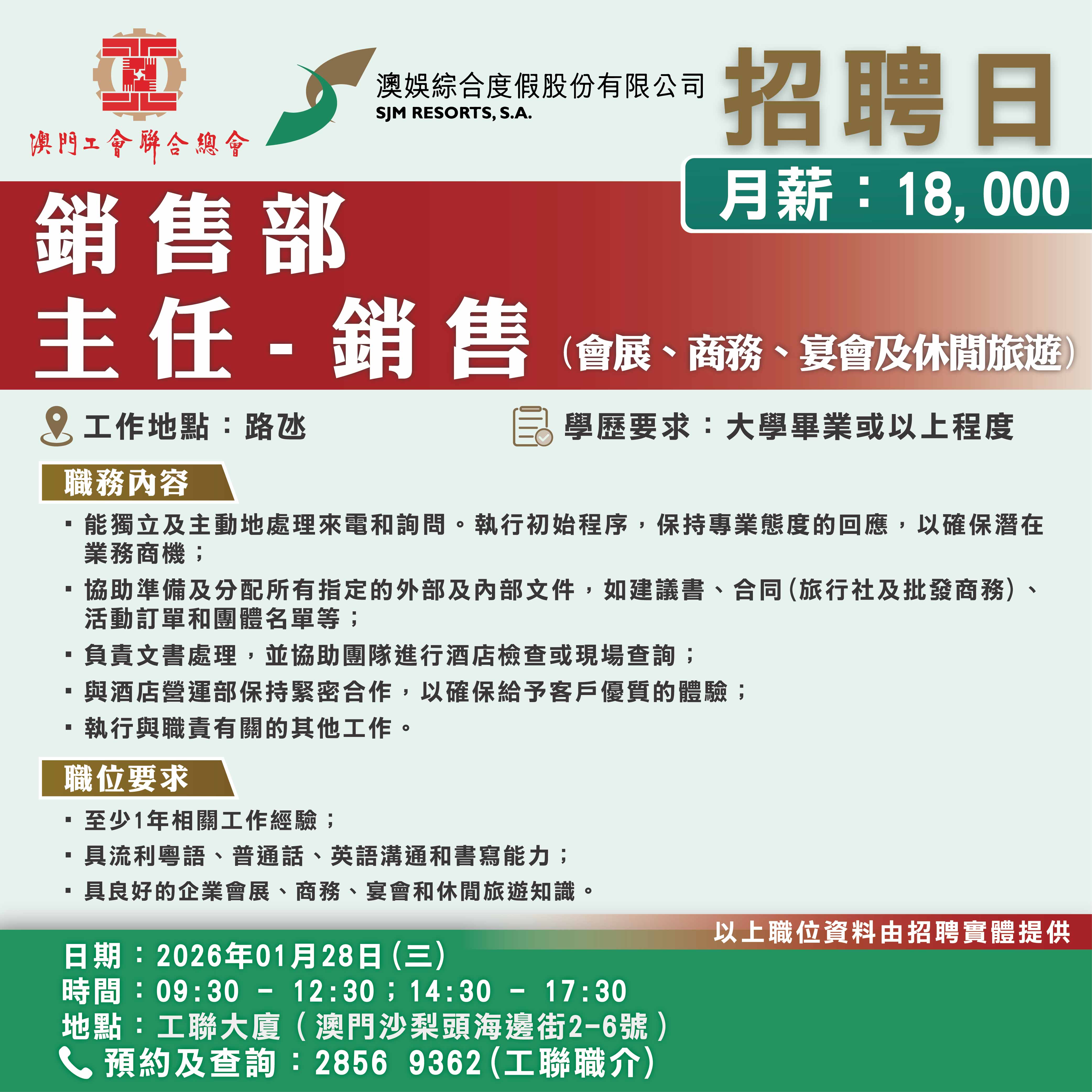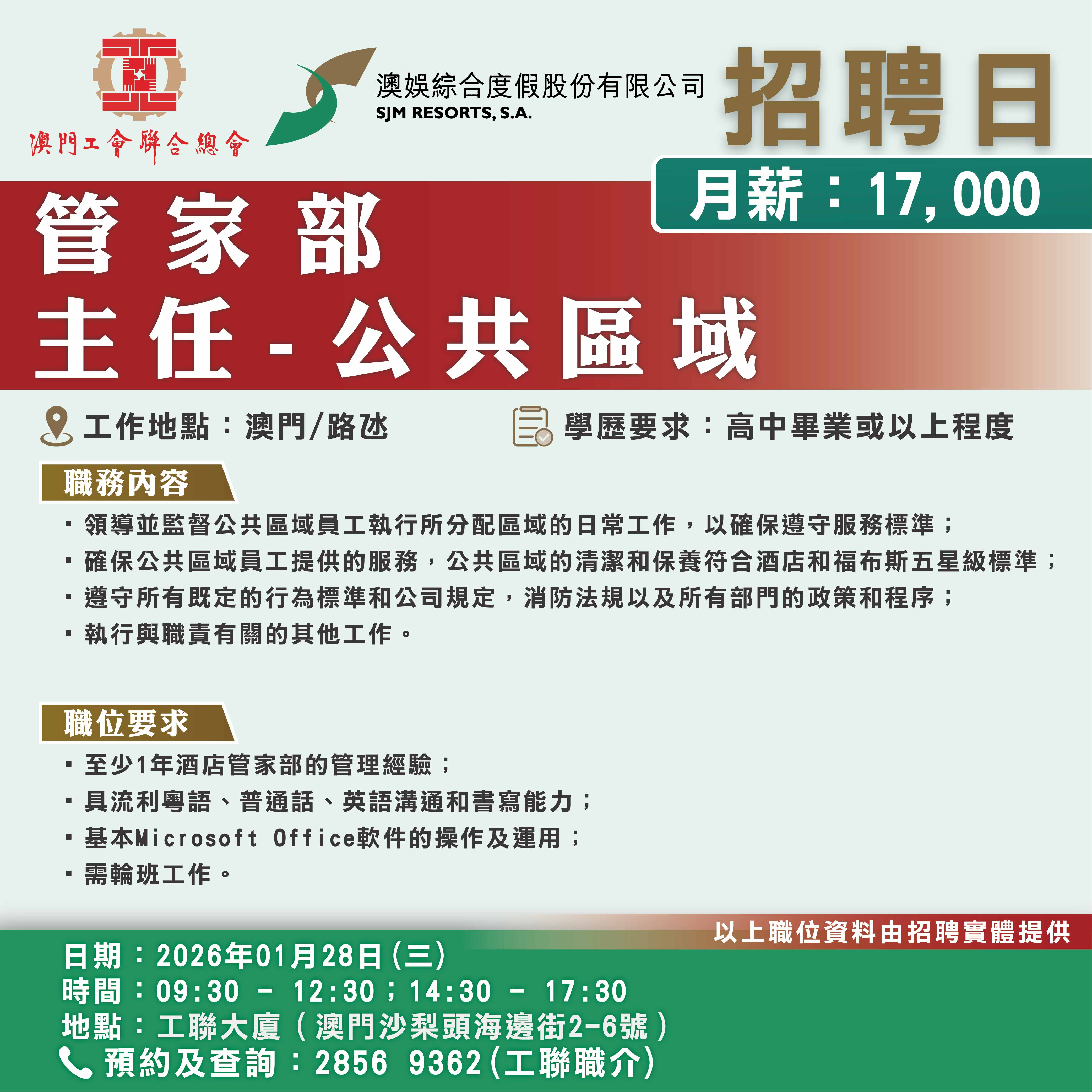 1月28日工聯總會與澳娛綜合度假股份有限公司舉辦招聘日,招聘日將提供餐飲部、貴賓服務部、酒店營運部以及銷售部等多個部門職缺!