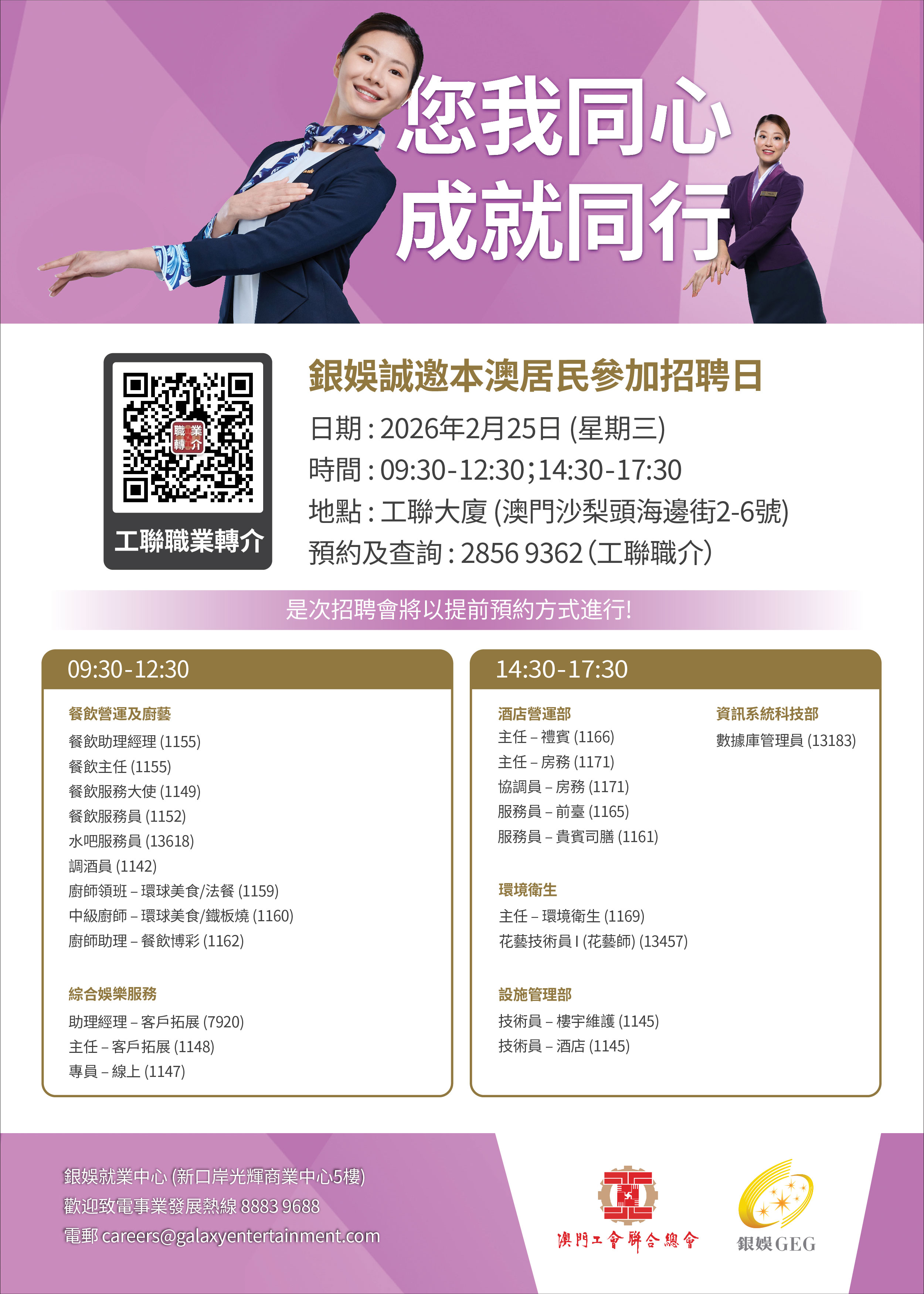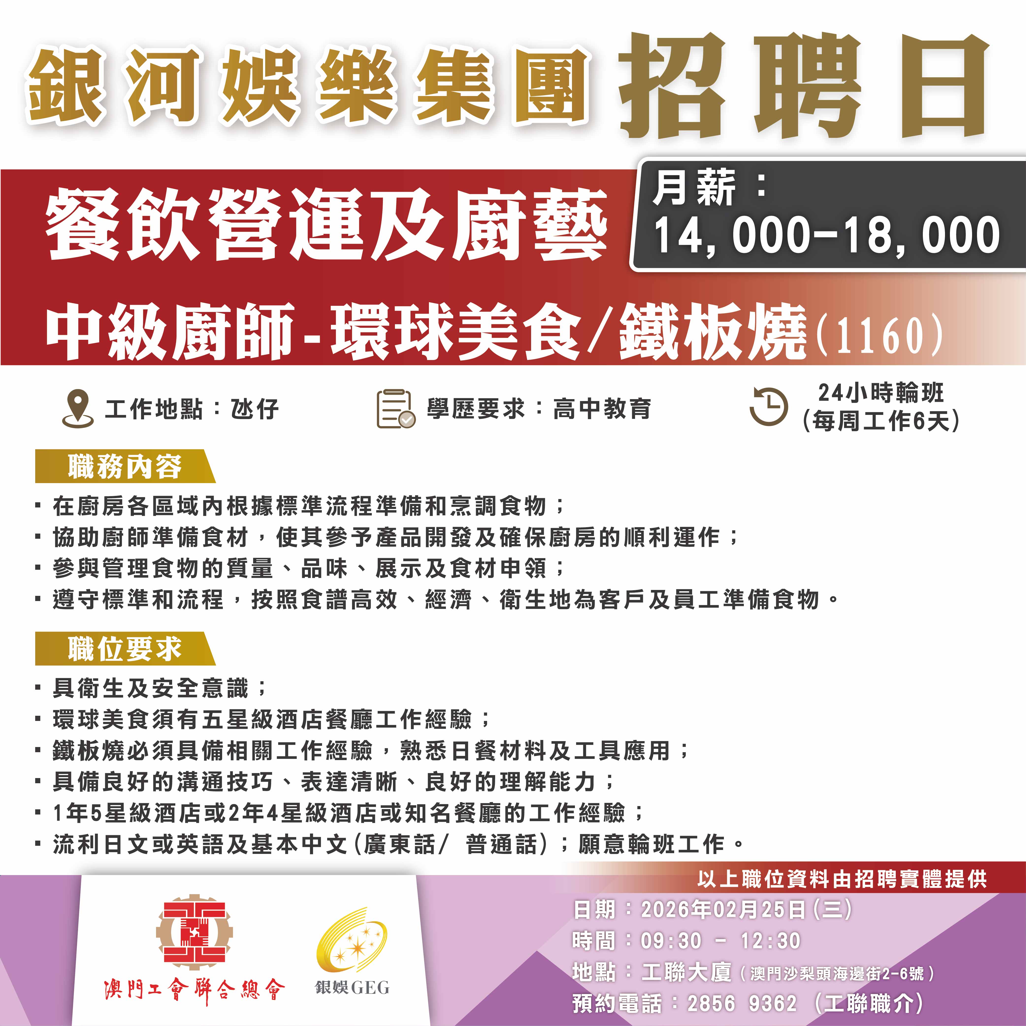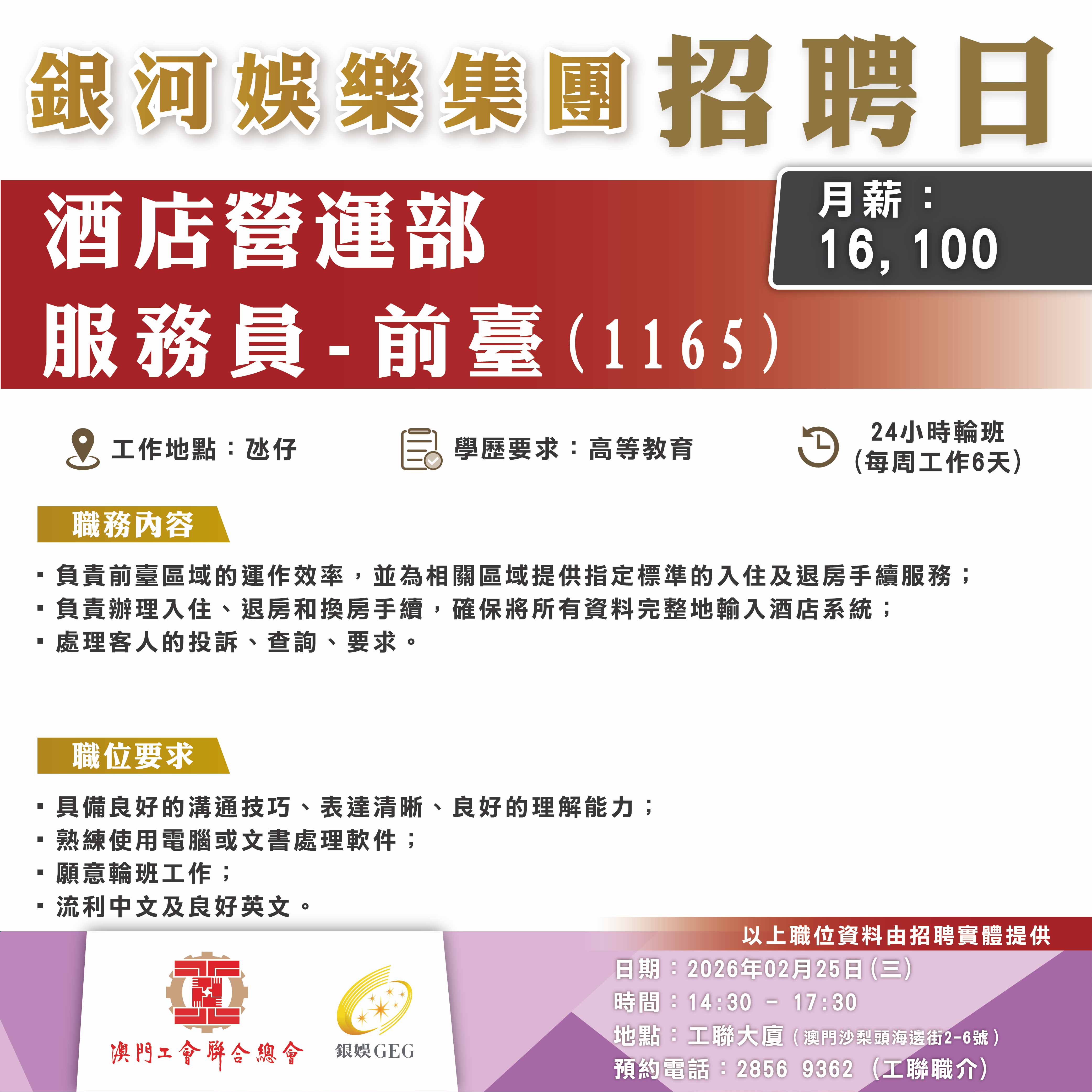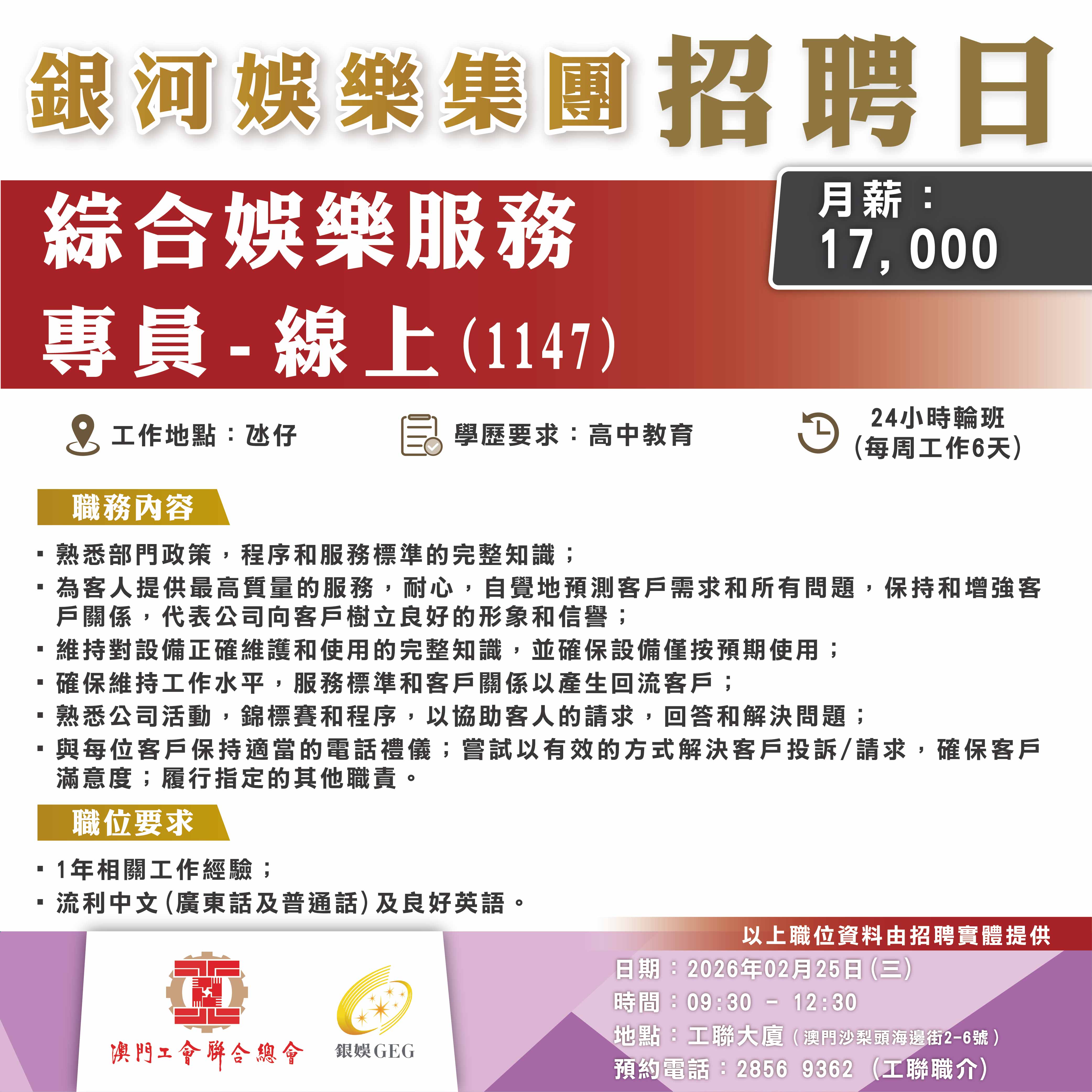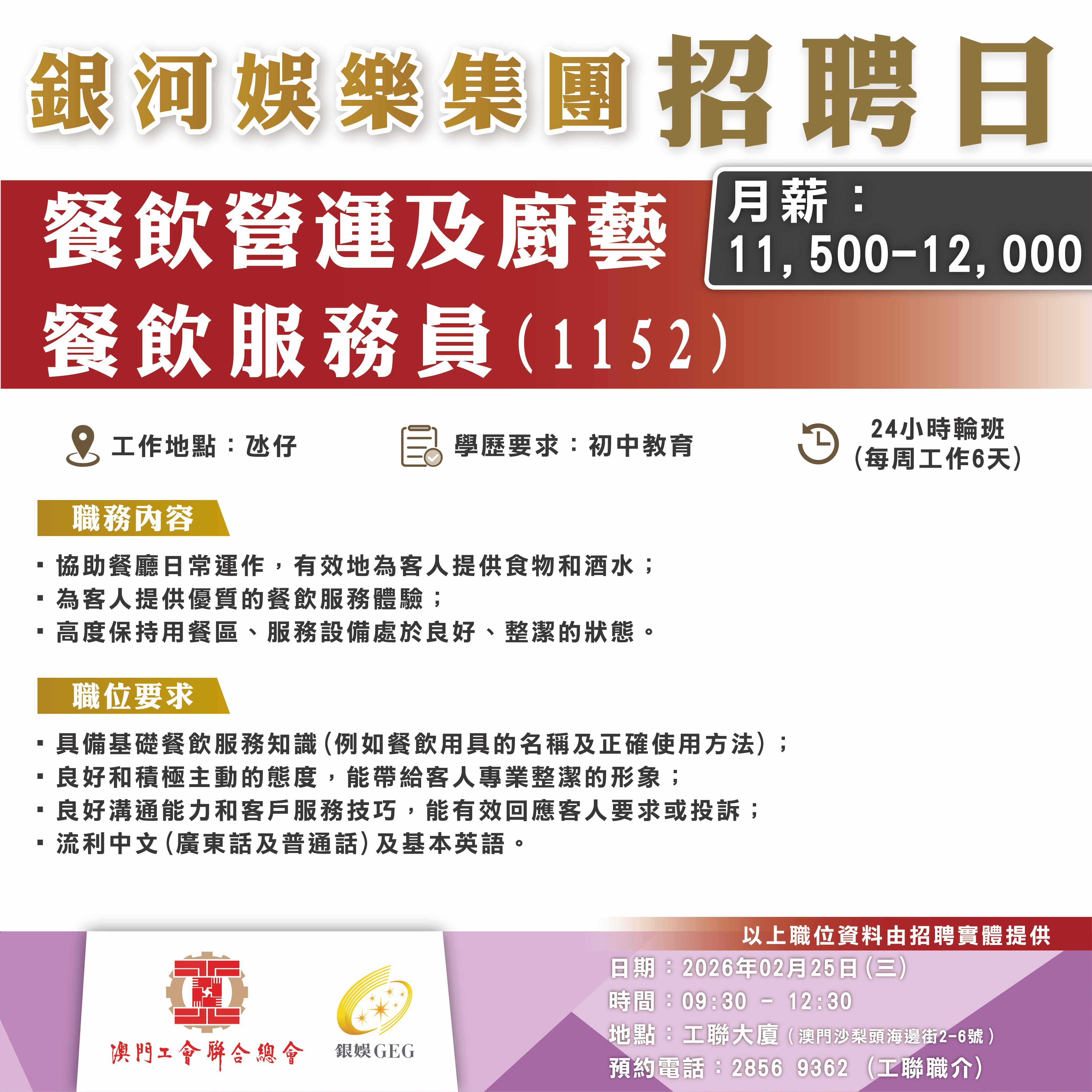 2月25日工聯總會與銀河娛樂集團舉辦招聘日,職位多元涵蓋前線、餐飲、技術及管理等多個部門共22類職位。部分職位需配合輪班工作,歡迎有就業需求的澳門居民前來求職!