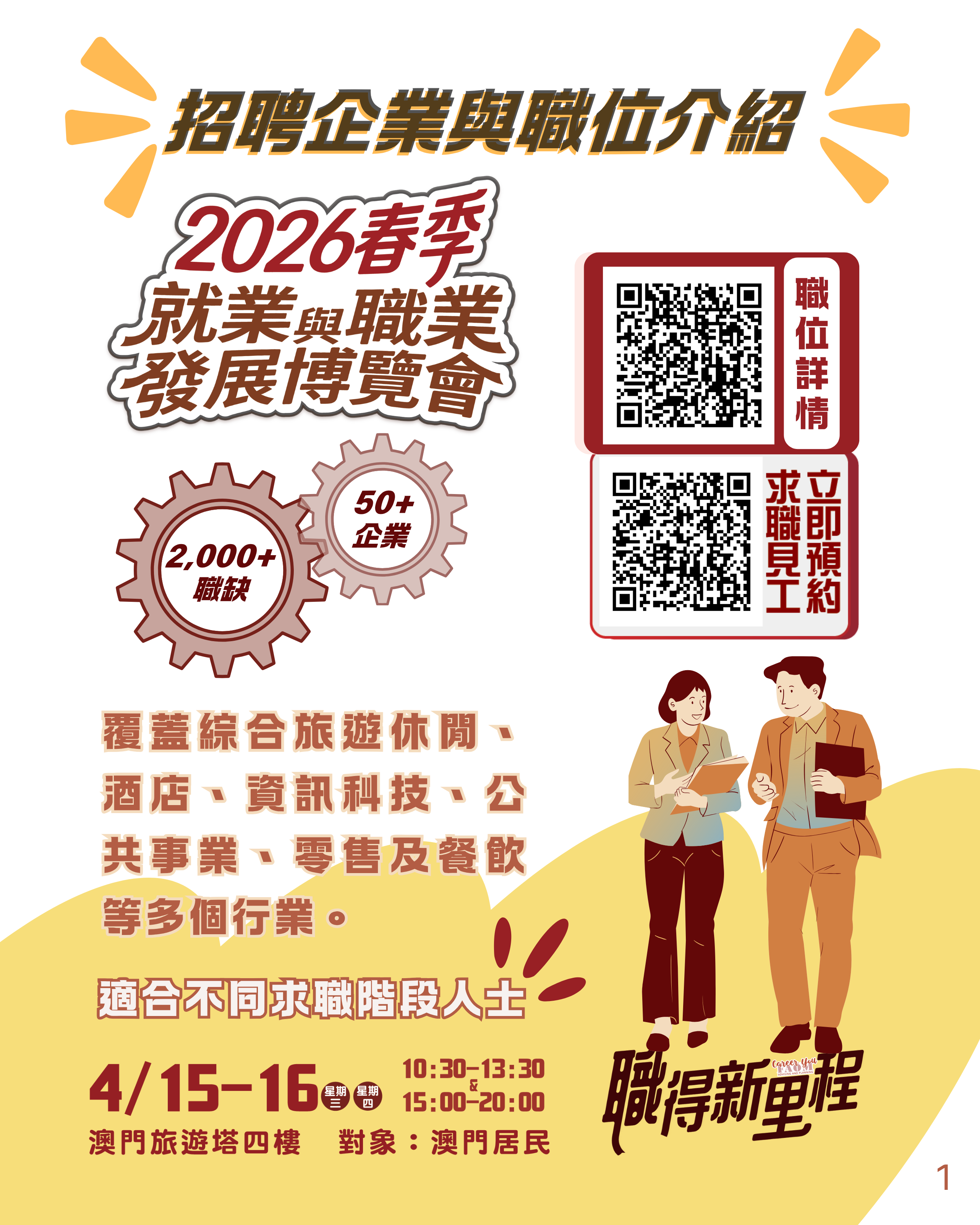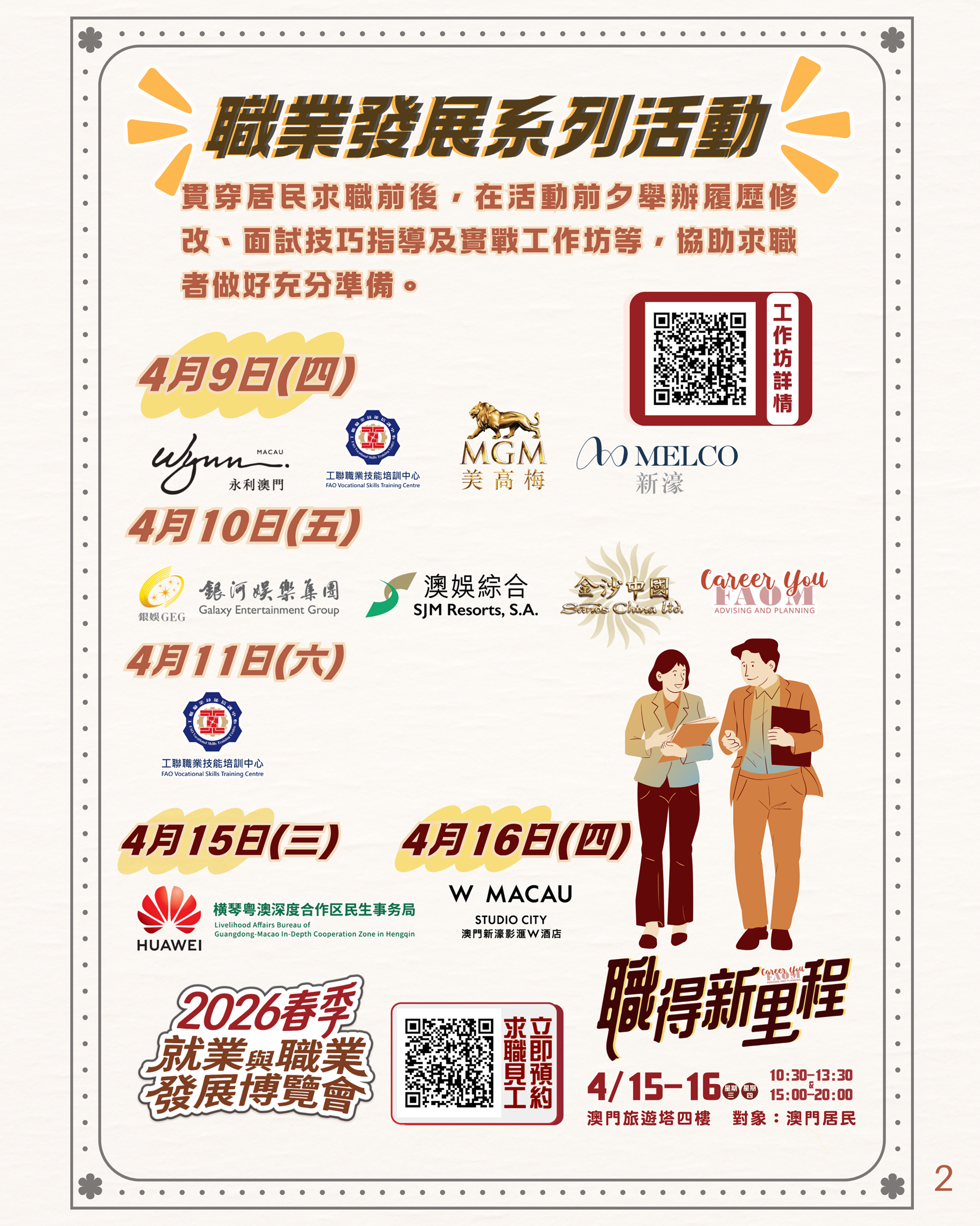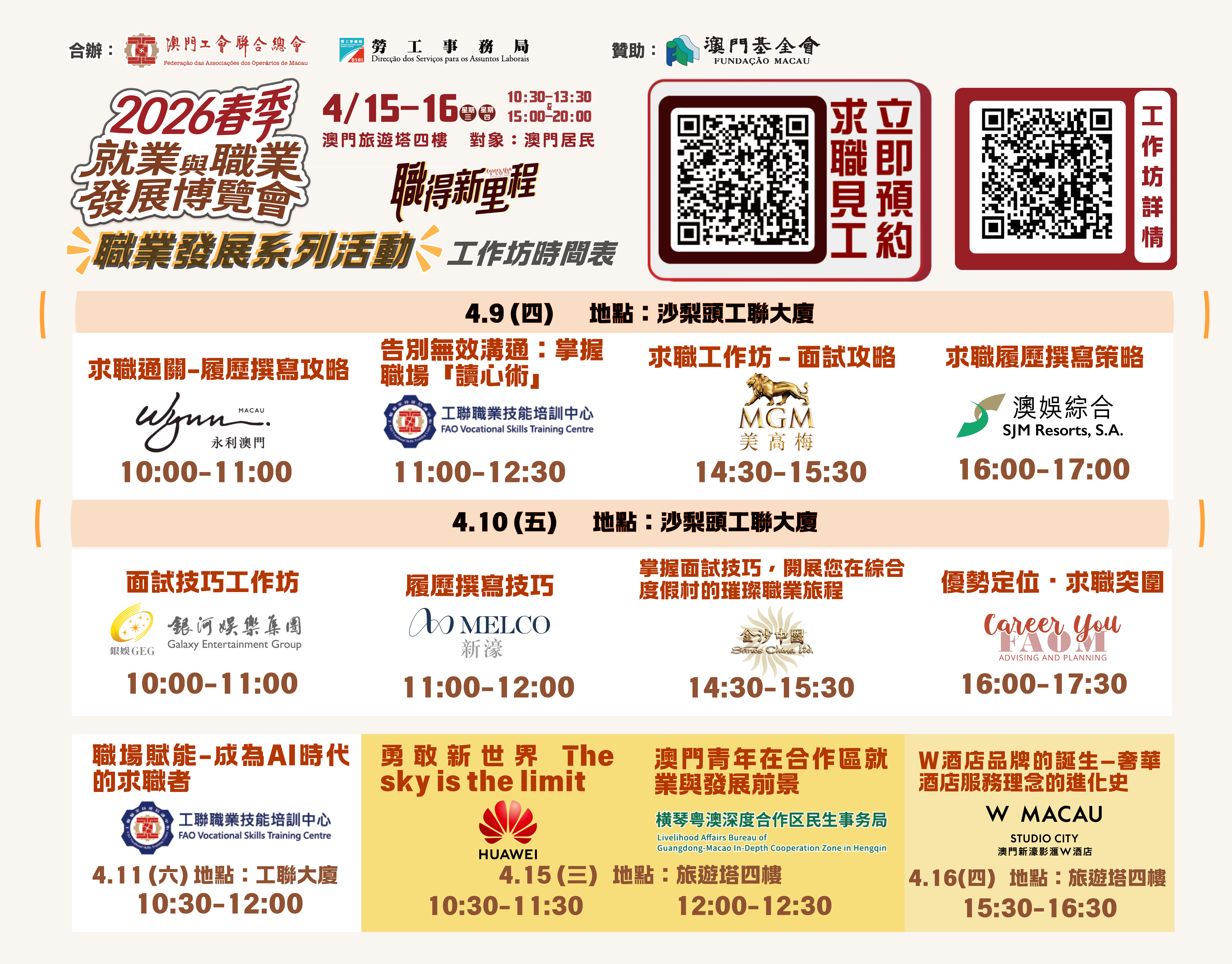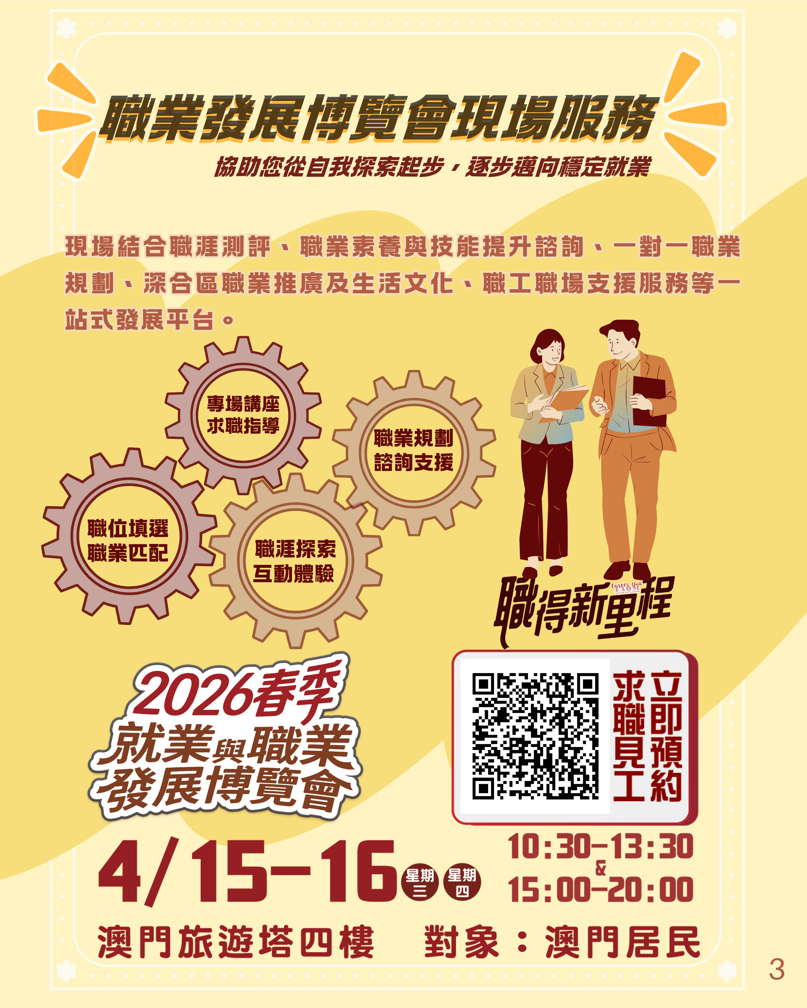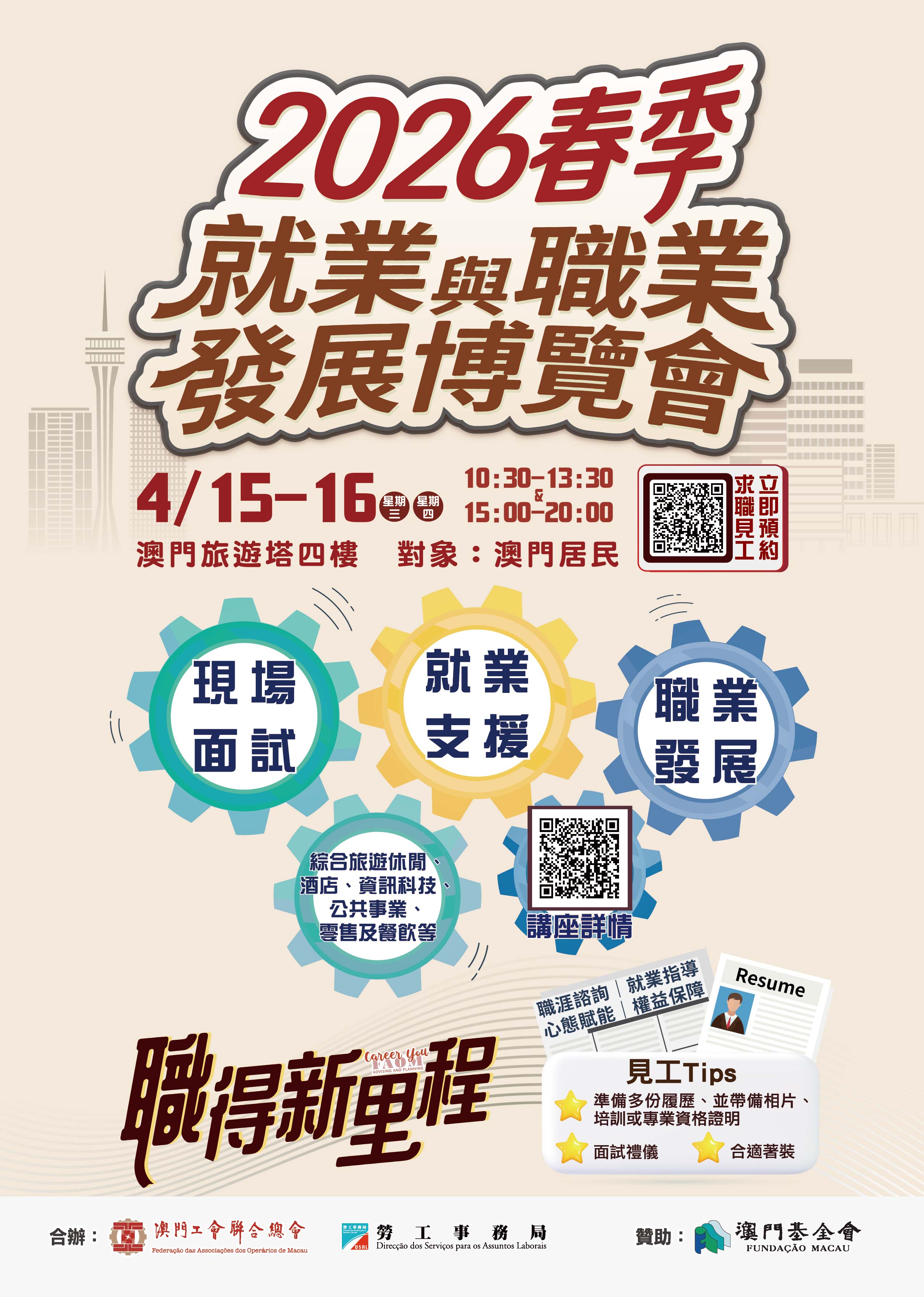 博覽會於4月15日及16日(星期三及星期四)假澳門旅遊塔會展娛樂中心四樓舉行,每日開放兩個時段供本澳居民預約入場,上午時段為早上10時30分至下午1時30分,下午時段為下午3時至8時。有意參加的本澳居民可由3月31日至4月13日,登入勞工局網站活動專頁: https://www.dsal.gov.mo/zh_tw/standard/spring_jobfair2026.html報名。名額有限,預約從速。參加職業發展系列活動的人士請留意各場的報名截止日期及舉行日期。